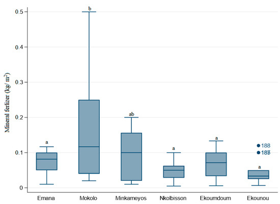 The results of the analysis revealed that the amounts of mineral fertilizer were significantly higher in the farms of Mokolo compared to those in the Ekounou, Nkolbisson, Emana, and Ekoumdoum areas, though there was no difference in mineral fertilizer use between farms in the Mokolo and Minkoameyos areas.