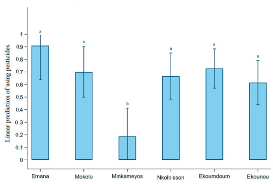 Probability of using pesticides in the studied areas of Yaoundé (same letter indicates no significant differences at p < 0.05 at 95% confidence intervals).