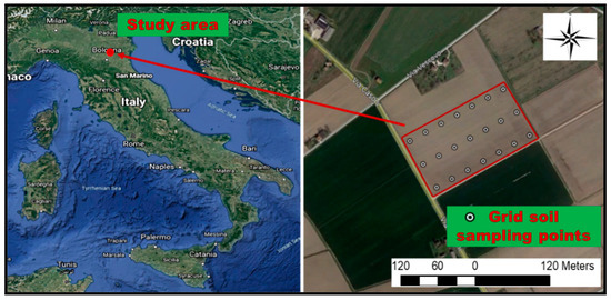Spatial soil variability was determined through the grid soil sampling technique. At each grid, one representative soil sample was collected at 0.0–0.3 and 0.3–0.6 m soil depth, and the position of each sampling site was recorded with a Trimble GPS. In this way, 21 soil samples were collected to assess the soil physical-chemical properties over the entire field during the year 2019, as shown in Figure 1. A manual soil probe was used for collecting the soil samples. At the end, all samples were air-dried at 40 °C and sieved to 2 mm diameter.