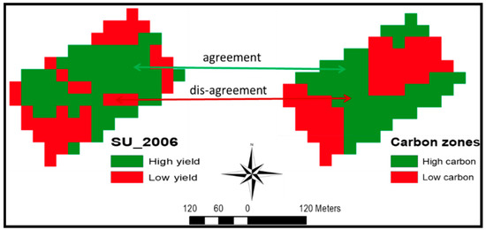 Since the main goal of this study was to optimize crop productivity, the two-zone maps based on single or multiple parameters were compared with the two-zone yield map (reference map). According to the procedure used, each pixel of the map (independent variable/s) was compared with the same cell of the two-zone yield map (Figure 2). Pixel agreement was calculated as being the number of pixels belonging to the same zone (i.e., number of pixels belonging to a high yield zone (e.g., map of SU_2006) and a high single soil property zone (e.g., map of carbon zones), plus the number of pixels belonging to low yield zone and a low soil property zone, divided by the total number of pixels, to provide an index of the overall accuracy, i.e., a degree of spatial agreement between the compared data. In contrast to this, disagreement was established if there was no zone consistency between pixels of independent variable/s and yield maps.