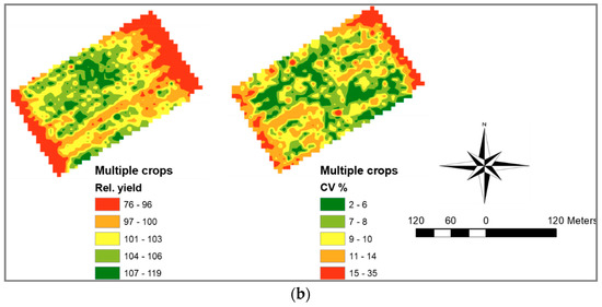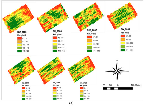 Over multiple crops, the spatial map was delineated by calculating the averaged values (relative percentage) laid over seven years of crop yield with this formula, shown in Equation (3).