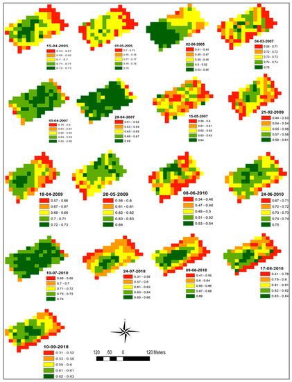 Over a single crop, the formula of Equation (2) was used to delineate the spatial maps over a single crop of the specified year: