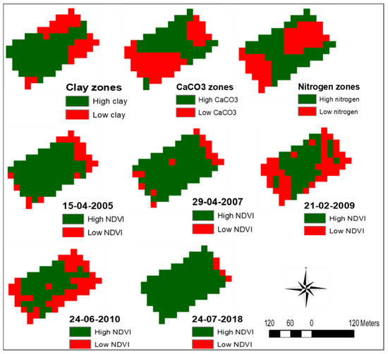 In order to select the parameters of soil and NDVI indices that could be the best candidates for delineating the management zones, based on the multiple soil traits and NDVI indices, we selected the three soil traits (clay, CaCO3, and N), which showed the best correlations with multiple crops’ yield data. For the selection of NDVI data, we chose data from one acquisition date per year, which presented high and significant correlations with yield data in each specific year (15 April 2005, 29 April 2007, 21 February 2009, 24 June 2010, and 24 July 2018). However, no NDVI data was chosen for SU 2006 and MA 2018 due to insignificant correlations.