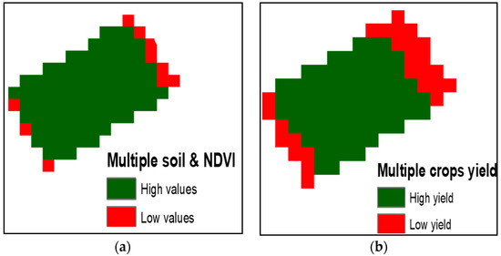 Two-zone multiple soil and NDVI map, (a); two-zone multiple crops yield map (b).