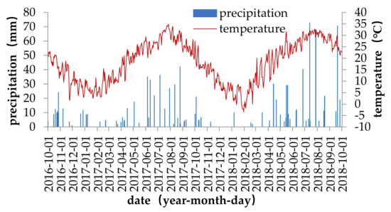 The field experiments were conducted at the comprehensive test site of the Farmland Irrigation Research Institute (Chinese Academy of Agricultural Science, CAAS) in Xinxiang (35°18′ N and 113°54′ E) from October 2016 to June 2018 wheat-growing seasons. The meteorological data were obtained based on a 60-year average from Xin Xiang Weather Station that is located 50 m from the experimental field. The average annual temperature was 14.1 °C, frost-free period was 210 d, sunshine duration was 2398.8 h, annual average evaporation was 2000 mm, and annual average rainfall was 588.8 mm. The rainfall was 468.4 mm and 573.7 mm from October 2016 to September 2017 and October 2017 to September 2018 in winter wheat–summer maize growth season, respectively, and 18.4% and 0.14% lower than that average rainfall 574.5 mm of a long term from 1951 to 2015. The rainfall of winter wheat growth seasons was 201.4 mm in 2017 and 218.6 mm in 2018, respectively. The distribution of precipitation and temperature during winter wheat growth period in 2016−2018 are shown in Figure 1.