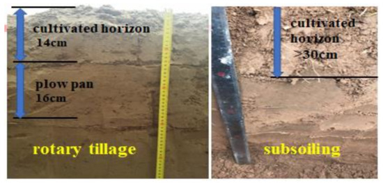 Position of cultivated horizon and plow pan in soil profile under rotary tillage and subsoiling.
