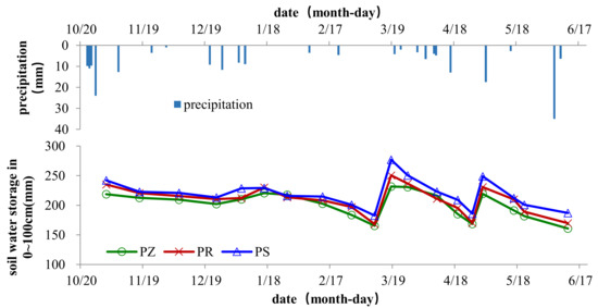 Different tillage measures have changed the structure of soil cultivated horizon, thereby affecting the distribution of soil water storage. Dynamic change trend of soil water was approximately consistent at 0~100 cm among different treatments in 2017 (Figure 4). PS treatment exhibited higher soil water storage capacity after irrigation and/or rainfall due to the loose topsoil and the destroyed plow pan, which was more conducive to the deep movement of soil moisture and root water uptake as compared with PR and PZ treatment. Soil evaporation dominated most of the water consumption during the seedling stage and wintering period (128 days with total rainfall of 118.2 mm and maximum rainfall of 24 mm) and the soil water storage of PS was insignificantly higher than PR and PZ treatment. Compared to PZ treatment, soil water storage of PS treatment increased apparently by 13.41% and 19.48% (p < 0.05) after irrigating on 16 Mar and 29 Apr, respectively, and the corresponding amplification for PR treatment was 5.86% and 8.11% (p > 0.05).