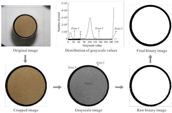 The procedure of digital image processing is illustrated in Figure 1. All steps were implemented in batch mode by programmed morphological algorithms in MATLAB R2016a (MathWorks, Boston, USA). First, the round region of interest (diameter 52 mm, inner ring of the top of the cutting ring) was cut out from the original images and resized to a resolution of 1560 × 1560 pixels. Next, the cropped images were converted into grayscale images (grayscale value of the pixels ranges from 0 to 255). From the image, it was apparent that quantifying the horizontal deformation of the soil required the segmentation of the shrinkage zone (zone 1) and the soil matrix (zone 2), and these two zones could be easily identified because of the high contrast, while the four corner zones (zone 3) were useless and had a detrimental effect on threshold segmentation. Therefore, the pixels in zone 3 where the grayscale values approached 255 were removed, and afterwards, a segmentation algorithm named ‘OTSU’ [42] was employed to determine an appropriate segmentation threshold (T). According to the threshold, the grayscale images were transformed into raw binary images. The miscellaneous spots in the raw binary images were cleared by a combination of ‘closing’ and ‘opening’ operations. Then, the final binary images for post-calculation were derived. The cross-section area of the soil samples was determined from the proportion of 0 and 1 pixels in the entire image.