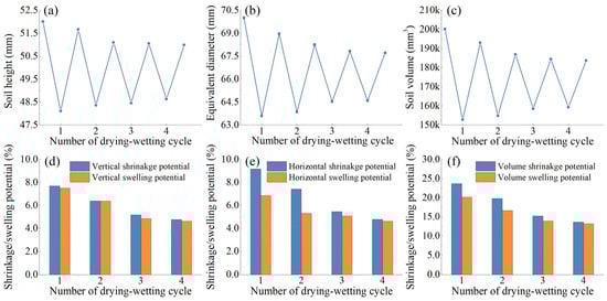 Evolution of soil size and shrinkage–swelling potential during four drying–wetting cycles. (a) Soil height; (b) Soil equivalent diameter; (c) Soil volume; (d) Vertical shrinkage/swelling potential; (e) Horizontal shrinkage/swelling potential; (f) Volume shrinkage/swelling potential.