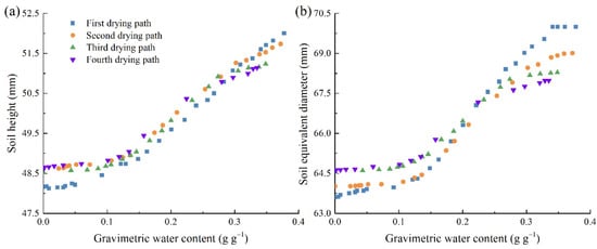 Dynamics of soil height and equivalent diameter during four drying paths. For brevity, only the data of replicate 1 are presented. (a) Soil height; (b) Soil equivalent diameter.