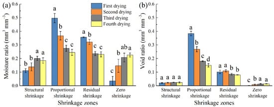 The distribution of moisture ratio and void ratio in different soil shrinkage zones during four drying paths are displayed in Figure 5. During the four drying paths, all the shrinkage curves had four complete shrinkage zones: structural shrinkage, proportional shrinkage, residual shrinkage and zero shrinkage. However, there were appreciable differences in the distribution of moisture ratio and void ratio in shrinkage zones across different drying paths. With respect to moisture ratio, it was evident that during the first and second drying path, the proportional and residual shrinkage zone had the highest moisture ratio, both of which accounted for more than 30% of the total water loss, indicating that these two zones dominated the soil moisture variation. In particular, during the first drying cycle, the moisture ratio within the proportional shrinkage zone was 0.49 cm3 cm–3 which was almost half of the total change of moisture ratio. However, with the increasing number of drying–wetting cycles, the moisture ratio within these two zones was significantly reduced. During the third and fourth drying cycle, the moisture ratio within the two zones was close to 0.22 cm3 cm–3. By contrast, the other two zones, the structural and zero shrinkage zone, gradually played important roles in water loss. Between the second and third drying paths, the decrease in moisture ratio within the proportional and residual shrinkage zone and the increase within the structural and zero shrinkage zone reached the significance level. With regard to the distribution of the void ratio, the proportional shrinkage zone occupied the most void ratios across all cycles, indicating that this shrinkage zone dominated the soil deformation, although the void ratio within the proportional shrinkage zone sharply decreased as the cycles proceeded, and during the last drying cycle, the ratio approached 0.15 cm3 cm–3. The void ratio within the structural shrinkage zone almost remained unchanged at around 0.02 mm3 mm–3 across cycles. The ratio within the residual shrinkage zone and zero shrinkage zone, respectively, exhibited a slight downward and upward tendency with the repeated cycles. It was worth noting that the distribution of moisture ratio and void ratio in the shrinkage zones during the last two cycles were not significantly different at the significance level of 0.05, implying that the soil samples nearly reached an equilibrium state after three drying–wetting cycles.