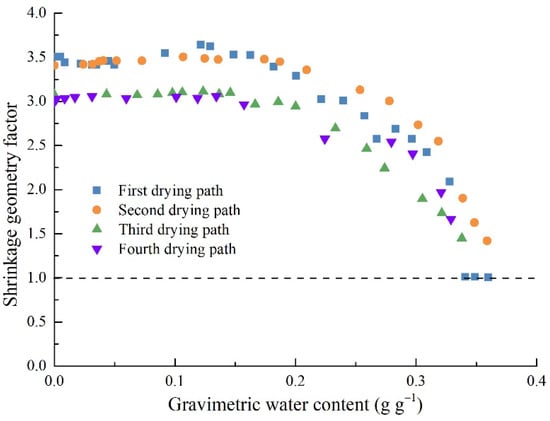 The variation of the shrinkage geometry factor with decreasing soil water content is displayed in Figure 6. For all drying paths, the shrinkage geometry factor exhibited similar trends. At the beginning of drying, the shrinkage geometry factor was close to or slightly larger than 1.0, indicating that vertical shrinkage was overwhelmingly dominant while horizontal shrinkage was negligible at the outset of drying. Subsequently, the shrinkage geometry factor steeply increased, suggesting a fast increase in horizontal shrinkage. When the soil water content approximately decreased to around 0.20 g g–1, the shrinkage geometry factor entered a relatively stable plateau where its value was generally fluctuating between 3.0–3.5 until the end of drying.