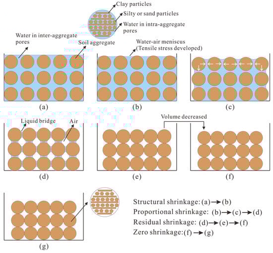 Regarding the shrinkage zones, it was found that during all drying paths, the soil had four complete zones. Figure 7 present the simplified shrinkage process of soil during drying. When the initially saturated soil was under drying conditions (Figure 7a), water in inter-aggregate pores was lost from the soil surface by evaporation or drained from the bottom by gravity (not shown in Figure 7). Soil subsidence occurred, and the water–air meniscus formed in soil (Figure 7b), causing capillary suction and thus tensile stress among aggregates [2,11]. The tensile stress increased as the meniscus became more curved due to further water loss, and when it reached large values, which we called critical tensile stress, the soil aggregates were driven significantly closer to each other. The process before the critical tensile stress was reached was structural shrinkage. After that, the soil shrinkage entered proportional shrinkage, and the soil shrank rapidly, mainly originating from the deformation of the soil skeleton (Figure 7c). As evaporation proceeded, the meniscus developed inside the soil and gradually evolved into a liquid bridge between aggregates which continued pulling the aggregates closer (Figure 7d). After the rupture of liquid bridges (Figure 7e), the shrinkage velocity significantly slowed down, and the soil shrinkage reached residual shrinkage, during which the water was mainly evaporated from the intra-aggregate pores, and the soil shrinkage primarily resulted from the volume decrease of aggregates (Figure 7f). As the drying continued, the water loss in intra-aggregate pores no longer caused the volume change of aggregates, at which point the soil shrinkage entered zero shrinkage (Figure 7g).
