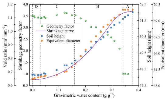 Correspondence among the evolution of soil height, equivalent diameter, soil shrinkage curve and shrinkage geometry factor during drying. A, B, C and D represent structural, proportional, residual and zero shrinkage zones, respectively. For brevity, only the data of replicate 1 during the first drying path are presented.