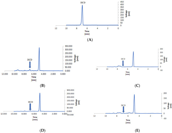 - Kim, D.G.; Giltrap, D.; Saggar, S.; Palmada, T.; Berben, P.; Drysdale, D. Fate of the nitrification inhibitor dicyandiamide (DCD) sprayed on a grazed pasture: Effect of rate and time of application. Soil Res. 2012, 50, 337–347. [Google Scholar] [CrossRef]