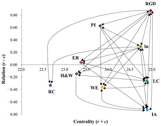 The five factors in the “effect” group are health and welfare, living conditions, rural culture, working environment, and industrial activation, in descending order by relation, industrial activation, living conditions, working environment, health and welfare, and rural culture in descending order by centrality. From the view of rural SDGs, facilitating industrial activation and improving living conditions and working environment are also major goals that the government of Taiwan wants to achieve for implementing rural SD related plans. Therefore, three factors—industrial activation, living conditions, and working environment—have reciprocal causal effects on each other.