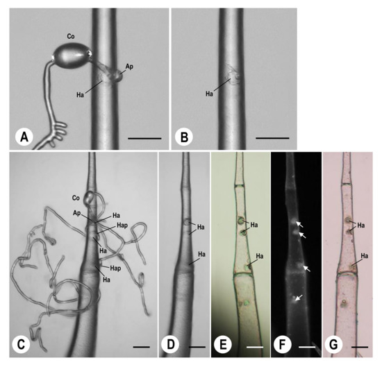 Digital (A–D), light and epifluorescent (E,F), and light (G) micrographs showing haustoria of KTP-03 and papilla-like structures in leaf type I trichome cells of tomato cv. Moneymaker (MM) in the same field of view. (A,C) KTP-03 conidium (Co) formed one haustorium (Ha) beneath the primary appressorium (Ap) (A) and 3–4 haustoria (Ha) beneath the primary appressorium (Ap) and hyphal appressoria (Hap) on the trichome cells (C). (B,D) One (B) and three haustoria (D) located in a trichome cell after the removal of KTP-03 hyphae from the trichome cells shown in (A,C) (at 2 days and 7 days after inoculation of KTP-03 conidia), respectively, using a small glass needle. (E,F) Without chemical treatment, haustoria (Ha) exhibited spherical structures (E) and papilla-like structures (white one-sided arrows) fluoresced in a single trichome cell (F). (G) With chemical treatment, haustoria (Ha) were stained light brown. Micrographs were acquired at 2 days (A) and 7 days (C) and after inoculation with KTP-03 conidia. Bars indicate 20 µm.