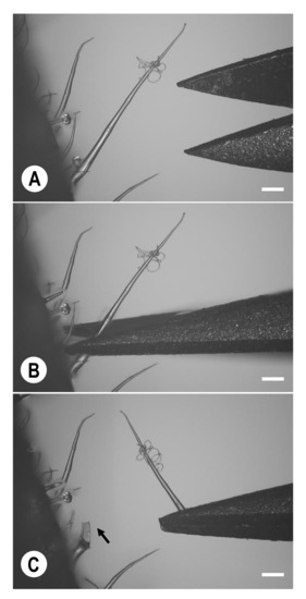 Procedure for the collection of single KTP-03-non-inoculated/inoculated leaf type I trichome cells of tomato cv. Moneymaker (MM). The basal cells of single trichomes were cut using small, pointed scissors (microscissors) installed in a micromanipulator. The microscissors were placed near the trichome basal cell (A) and directed towards that cell (B). Finally, the KTP-03-inoculated trichomes were cut using the microscissors held by the MSC-2 manipulator under a KH-2700 DM (C). Arrow in (C) indicates the location where a single trichome cell was successfully cut. Bars indicate 150 µm.
