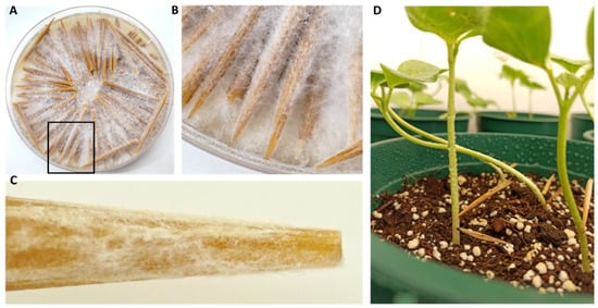 Inoculation method with infected wooden toothpicks. (A) Photograph of a representative rich medium plate used for toothpick inoculation after one week of M. maydis growth. (B) Closeup photograph of the black rectangle depicted in (A). (C) Magnitude of one wooden toothpick’s tip covered with dense white fungal hyphae. (D) Two-week-old cotton sprouts undergoing the dual inoculation treatment with M. maydis and M. phaseolina.
