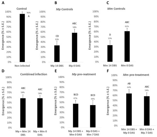 Effect of the inoculation order of M. maydis and M. phaseolina on the emergence of cotton buds. First repetition results. Pima cv. cotton sprouts were grown in a growth room, and aboveground emergence values were estimated 10 days after sowing (DAS). (A) Control—uninfected healthy plants. The plants were inoculated separately (B,C), in combination (D), or one after the other (E,F) by the fungi M. phaseolina (Mp) and M. maydis (Mm). DBS—days before sowing. Values represent an average of six repetitions. Error lines represent a standard error. Statistical significance (p < 0.05) of variance was tested using the one-way ANOVA test and is represented by different letters (A–D) above the chart bars.