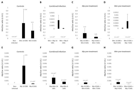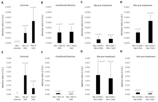 Real-time PCR results for M. maydis DNA (upper panel) and M. phaseolina DNA (lower panel). First repetition results. The effect of the combined or ordered soil infection with M. maydis and M. phaseolina on the fungal DNA in plant roots was measured on day 40 of growth. The control is non-infected healthy plants. The plants were inoculated separately (A,E), in combination (B,F), or one after the other (C,D,G,H) by the fungi M. phaseolina (Mp) and M. maydis (Mm). DBS—days before sowing; DAS—days after sowing. Y-axis shows the ratio of the specific M. maydis or M. phaseolina DNA segment to the housekeeping gene-encoding cytochrome C oxidase (COX). Values represent an average of six repetitions. Error lines represent a standard error.