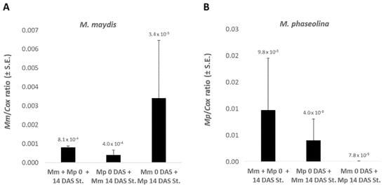 Infecting the sprouts with M. maydis at sowing and infecting them again by puncturing with M. phaseolina two weeks later led to an 8.5-fold increase in M. maydis DNA compared to the reverse procedure (Mp 0 DAS + Mm 14 DAS St.) (Figure 4). This procedure of M. maydis first followed by M. phaseolina stabbing inoculation caused M. phaseolina DNA values to drop to near-zero levels (ca. 100-fold lower levels). These tendencies are similar to those obtained without stabbing (Figure 3).