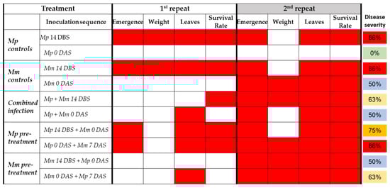 Total disease severity estimation of both experiment’s repetitions based on combining all symptoms measured. Red rectangle—any statistical difference from the control (uninfected healthy plants that achieved the highest growth parameters, p < 0.05). Disease severity percentages (on the right) are the relative amount of significantly different indices compared to the total measures (red rectangles/8 rectangles ratio).