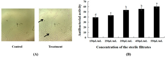 Plate inhibition experiments showed that both B. subtilis XZ18-3 and its sterile filtrates had an inhibitory effect on R. cerealis. It was observed under a microscope that mycelia treated with the sterile filtrates had a significantly increased number of branches, enlarged apical branches and deformed mycelia (Figure 1A). To assess the antifungal activity of the sterile filtrates of strain XZ18-3, their inhibition effect was determined. With an increase in the concentration of the sterile filtrates, the antifungal activity on R. cerealis was gradually enhanced. The results showed that the active substances produced by the metabolism of B. subtilis XZ18-3 could inhibit the growth of R. cerealis mycelia (Figure 1B).