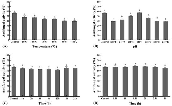 The stability of thermal, pH, illuminated light, and UV light were assessed according to the method of improved mycelial growth rate [28,29]. All experiments were performed in triplicate and antifungal activity was determined by the Oxford cup method mentioned above. The antifungal activity of sterile filtrates was calculated using the following equation [24]: