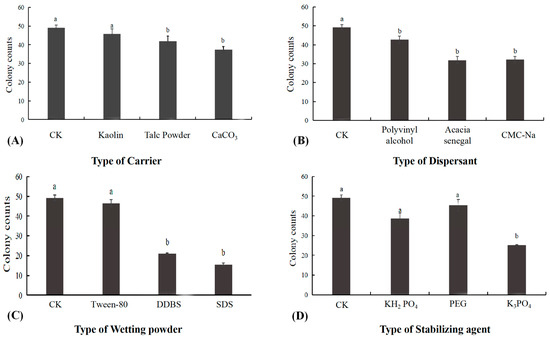 (A) The effect of different carriers on biocontrol activity; (B) The effect of different dispersants on biocontrol activity; (C) The effect of different wetting powders on biocontrol activity; (D) The effect of different stabilizing agents on biocontrol activity. Different letters above the bars indicate significant differences at p < 0.05 (according to Duncan’s multiple range test).