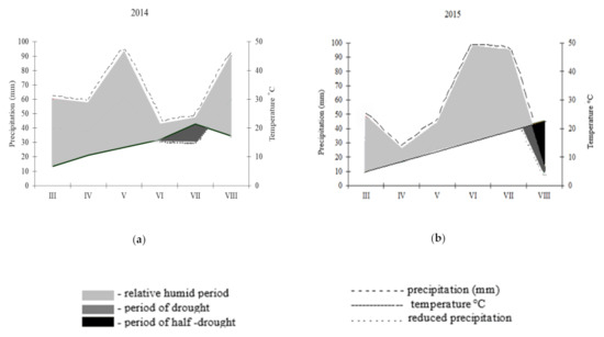 Climatic data characterizing weather conditions in Przebędowo, Poland in the experimental area during growing seasons (a) 2014 and (b) 2015 prepared according to Walter (1976).
