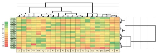 The heatmap showed a significant variation in the amino acid content depending on the variety and cultivation system (Figure 2).