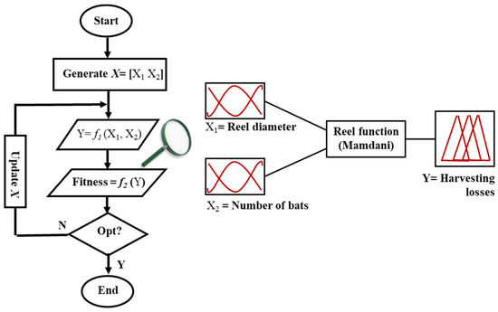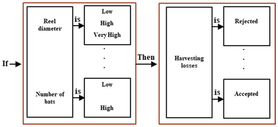 The field data incorporation with the defined MFs was employed to generate a set of if–then rules, called FAM bank. FAM bank contained a set of linguistic relationships between design variables and harvesting losses. If–then rules were enounced to compose the rule-base of the fuzzy system. Data gathered from field evaluations in the form of if–then rules were employed to develop a fuzzy model, as described in Figure 4. Each reel was a redesigned version of the previous one, where its functional operators were optimized for reducing losses. Two design parameters comprising the number of bats and the reel diameter fed the fuzzy model to calculate harvesting losses. The result was a fuzzy-based model that determines harvesting losses in a mapping function featuring three levels: accepted, marginally accepted, and rejected. Computation of rules performed via fuzzy conjunctions (Mamdani method).