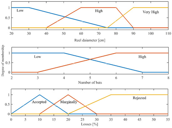 Fuzzy membership functions for the inputs reel diameter and number of bats, and output functions for the harvesting losses model.