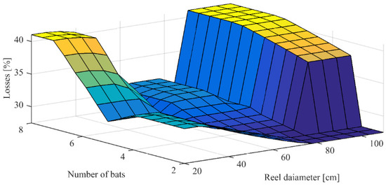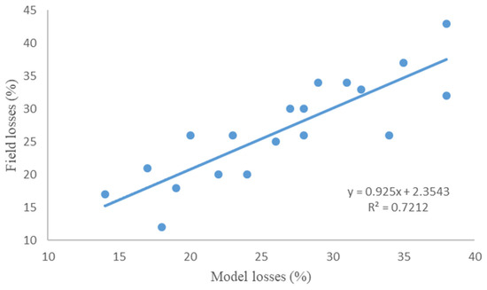 Figure 5 describes a non-concave surface for the relationship between shattering losses and the input variables number of bats and reel diameter. The outcomes of the field tests for evaluating the shattering losses in Model 2017 were applied for validating the fuzzy model. The validation results for the developed model are shown in Figure 6, where the predicted losses are plotted against the real losses with a coefficient of determination R2 = 0.72. This plot reveals that the proposed model represents the reel to a sufficient level of accuracy. Several works apply regression equations to estimate losses in machinery based on various functional parameters such as cutting speed, spacing, length, etc. [31,32,33]. However, in less linear optimization problems, as in the one posed in this paper, fuzzy logic models address the problem with greater flexibility and efficiency [34,35].