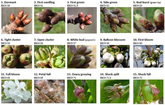 Buds were inspected under a Leica M80 stereo microscope fitted with a Leica DFC 295 camera and Leica software application suite version 3.8.0 and rated for bud phenological stage based on the BBCH growth stage scale for stone fruit [33,34] (Figure 1).