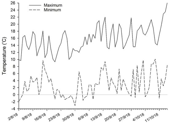 Maximum and minimum temperatures for the period from 2 August to 15 October 2018 (data obtained from Bureau of Meteorology station 95003—Bushy Park, Tasmania).