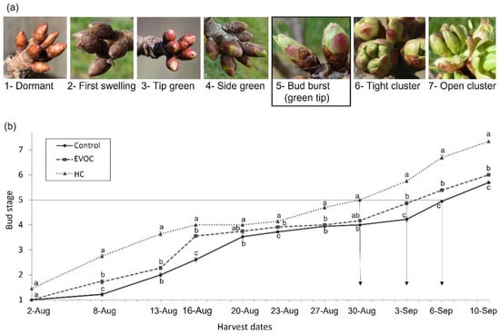 Floral bud development in the sweet cherry cultivar ‘Lapins’. (a) Representative stages of floral bud development and (b) floral bud stage over time of cherry trees treated with dormancy breakers hydrogen cyanamide (HC) and emulsified vegetable oil compound (EVOC) compared to control; arrows indicate the date that buds reached bud burst (stage 5). For (b) values are mean ± standard error (s.e.) (n = 4 branches, with 10 buds per branch); at each time point values with different letters are significantly different (p < 0.05).