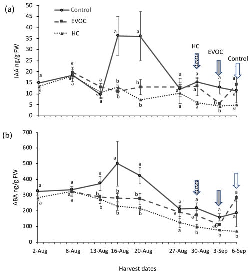 Hormone quantification in cherry buds revealed relatively small changes in auxin content over the sampling period and few significant differences between treatments (Figure 4a). The only result to note was that auxin levels appeared to increase in control plants from 16–20 August, which was not observed in HC- or EVOC-treated plants. There was a clear reduction in the abscisic acid content of buds both before and continuing after bud burst across treatments throughout the trial period (Figure 4b). There were some differences in trends between treatments, with both HC and EVOC exhibiting somewhat lower abscisic acid content than control plants at some sample points, although this was not observed in HC samples taken just prior to bud burst (27 August).