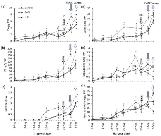 Cytokinin concentration (ng/g FW) in floral buds over time treated with dormancy breakers hydrogen cyanamide (HC) and emulsified vegetable oil compound (EVOC) compared to the control; (a) zeatin (Z), (b) zeatin riboside (ZR), (c) di-hydrozeatin (DiHZ), (d) di-hydrozeatin riboside (DiHZR), (e) isopentenyl adenine (Isop adenine) and (f) isopentenyl adenosine (Isop adenosine). Arrows indicate the date that buds reached bud burst (stage 5). Values are mean ± s.e. (n = 4); at each time point values with different letters are significantly different (p < 0.05).