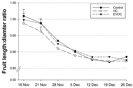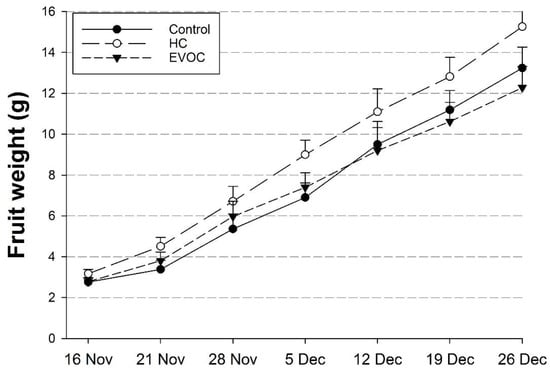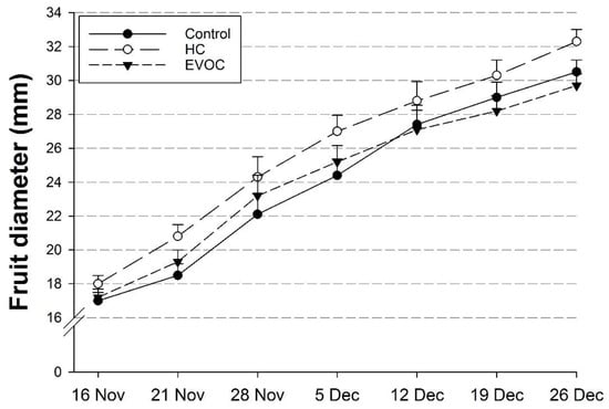 Fruit diameter (Figure 7) and length (data not presented) followed a similar pattern, with the exception of 28 November, when there was no significant difference between the HC and EVOC treatments.