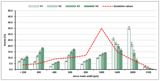 Variants 1 and 2 were defined by particularly high proportions (V1 = 30.6%, V2 = 21.8%) on sieves 2 and 3 (2000 and 1400 µm), whereby this trend was more apparent with V1 than with V2. In contrast to the other variants, in V1 these two sieve fractions were the largest in all cases. Variants 3 and 4 were characterized mainly by high relative proportions (V3 = 29.7%, V4 = 35.1%) on sieves 6 and 8 (500 and 200 µm). Although their shares tended to be lower on sieve 3 in relation to V1 and V2, the values there still averaged 19.7% (V3) and 16.3% (V4). The lowest percentages across all variants were on sieves 1 (V1 = 2.20%, V2 = 1.30%, V3 = 1.00%, V4 = 0.400%) and 7 (V1 = 2.50%, V2 = 4.50%, V3 = 5.70%, V4 = 6.60%). Additionally, it is remarkable that the particle size distribution of the feed not only changed over the variants, but that these changes even tended to show progressions. The comparison of the mean values of the variants on the individual sieve levels showed that there were recurring sequences among the variants: