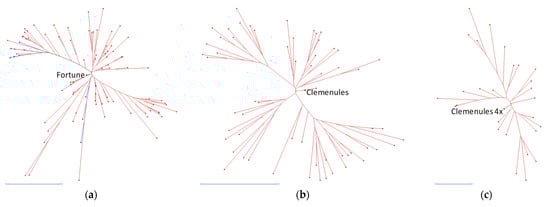 - Garcia-Lor, A.; Curk, F.; Snoussi-Trifa, H.; Morillon, R.; Ancillo, G.; Luro, F.; Navarro, L.; Ollitrault, P. A nuclear phylogenetic analysis: SNPs, indels and SSRs deliver new insights into the relationships in the ‘true citrus fruit trees’ group (Citrinae, Rutaceae) and the origin of cultivated species. Ann. Bot. 2013, 111, 1–19. [Google Scholar] [CrossRef] [PubMed]