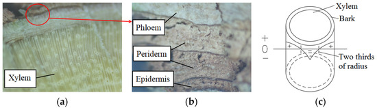 Thus, in this study, the growth stress and mechanical characteristics of jujube bark were studied. In order to ascertain the composition and structure of jujube bark in order to provide basic theorical evidence for the study of growth stress, the cross section of jujube bark was observed by microscope in advance. The cross-section of a jujube trunk was magnified 200 times and the results are shown in Figure 1a,b. The jujube bark is connected to the xylem by the phloem and consists mainly of three parts: the phloem, periderm and outer epidermis. Studies [23,24] have shown that both the xylem and phloem are generated by cambium cells through cell division and differentiation. In this process, primordial cells undergo a biomechanical transformation process that causes the cell to change in size with maturation. According to the literature [23], with new cells continuously attached to the surface of existing wood materials, this deformation no longer develops freely, but generates tensile stress along the axial direction and compressive stress in the tangential direction in the newly grown external wood materials. This kind of stress generated near the cambium leads to the stress distribution law on the cross section of its trunk, as shown in Figure 1c. It can be seen from the figure that trees bear compressive stress within 2/3 of the radius of the cross section. Beyond 2/3 of the radius of the cross section, the tree bears tensile stress, and the bark at the outermost layer of the cross section bears the maximum tensile stress.