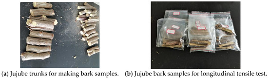The longitudinal tensile test samples were made with the size of 100 mm in length and 10 mm in width, as shown in Figure 2. The transverse tensile test samples were made with the size of 20 mm in length and 10 mm in width. The samples used in the transverse cutting experiment were 50 mm in length and 10 mm in width. In every test, each unique sample was used three times, and the results were averaged. The length direction of all samples was consistent with the direction of the bark fiber.