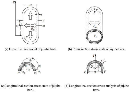 A part of the cylinder was intercepted with two sections (m-m and n-n at a distance of dz) and a longitudinal plane including the diameter to obtain the part shown in Figure 3c. According to the stress characteristics of the longitudinal section of jujube bark in Figure 3d, the mechanical balance Equation (6) could be obtained:
