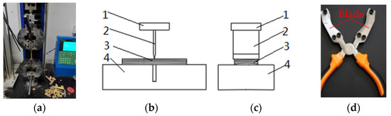 Figure 4. Equipment and platform for mechanical testing of jujube bark: (a) universal testing machine; (b) front view of the cutting test platform; (c) side view of the cutting test platform; (d) structure of the cutter blade used for the cutting test. 1. Blade fixture. 2. Cutter blade. 3. Jujube bark. 4. Support platform.