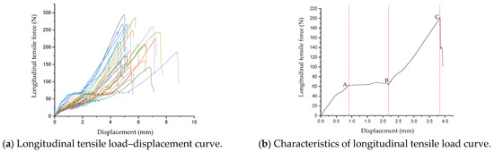 The results of longitudinal tensile test are shown in Figure 5. It can be seen from Figure 5a that the maximum load that the jujube bark could bear in different test groups was significantly different, and the load was in the range of 105.9~293.1 N. However, their yield load was basically the same, about 70 N. The calculation results showed that the longitudinal tensile strength was 16.3 MPa and the elastic modulus was 255.6 MPa. In addition, the variation law of the load–displacement curve of each group of tests was consistent. As shown in Figure 5b (average longitudinal tensile load), each load–displacement curve of tensile tests can be divided into three stages. From the beginning of the test to point A was the initial stage, practically the elastic deformation stage, and the load was basically linearly and positively correlated with the deformation. The second stage from A to B was a yield process. In this stage, the load changed little with the continuous increase in displacement. In the third stage from B to C, jujube bark was strengthened and restored its ability to resist deformation. The load increased approximately linearly with the increase in deformation, and the increase rate was greater than that of the first stage until the sample was pulled apart.