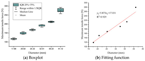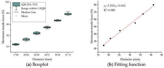 In order to observe the concentration, dispersion and distribution of extreme data of each group of tests, and to analyze the functional relationship between the maximum longitudinal tensile force of jujube bark and the corresponding diameter, the boxplot and data fitting line of the maximum tensile force were drawn (Figure 6). It can be seen from the boxplot (Figure 6a) that the Inter-Quartile Range (IQR) was small and there was no abnormal value, indicating that the data of each group of tests were relatively centralized. That is, the mechanical properties of jujube bark along the longitudinal direction were stable under the same natural state. According to the data fitting line of the maximum tensile force shown in Figure 6b, the maximum tensile load along the longitudinal direction of jujube bark was positively correlated with its corresponding trunk diameter. Furthermore, the determination coefficient R2 was 0.929, indicating that the fitted function had a high degree of fitting to the actual data. The fitting function is shown in Equation (8).