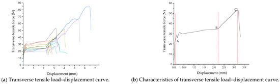 The transverse tensile test results of jujube bark are shown in Figure 7; these were significantly different from the results of the longitudinal tensile test. As shown in Figure 7a, the maximum transverse tensile load was 84.4 N and the minimum was 28.6 N, which was only 27.9% of the average longitudinal tensile load. The transverse tensile strength was 3.5 Mpa, and the elastic modulus was 724.14 Mpa, which was about 3.21 times the longitudinal tensile elastic modulus. It can be seen from Figure 7b (average transverse tensile load) that from the initial position of the test to point A was the approximate elastic stage of the transverse tensile load–displacement curve, and its slope was significantly greater than that of the corresponding stage in the longitudinal tensile test. The second stage AB was the transverse tensile yield process of the jujube bark, and the yield curves of different test groups were highly consistent in curve shape. In the third stage (from B to C), the load continued to rise in an approximate straight line with the deformation until the jujube bark load reached the transverse tensile limit and was pulled apart.